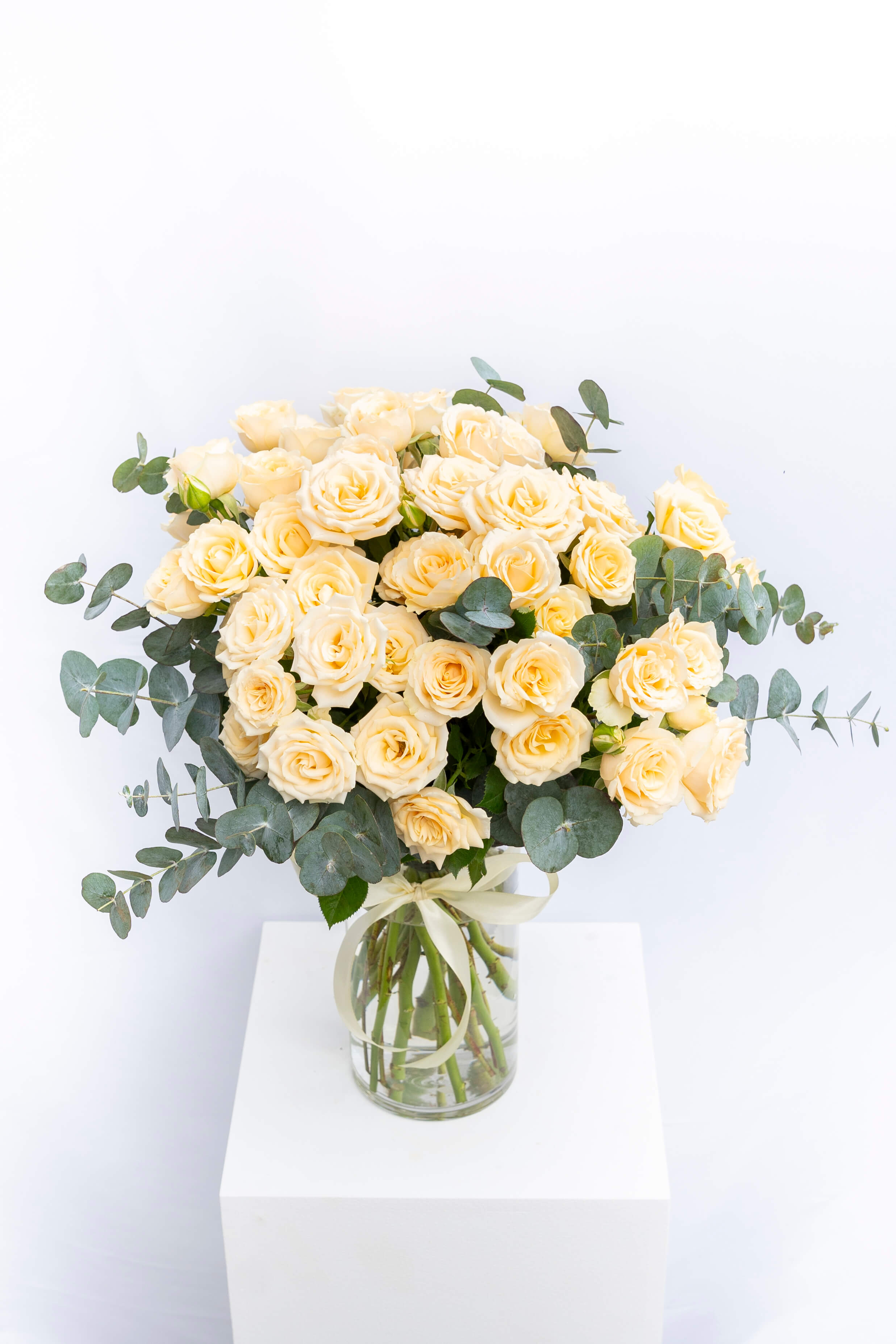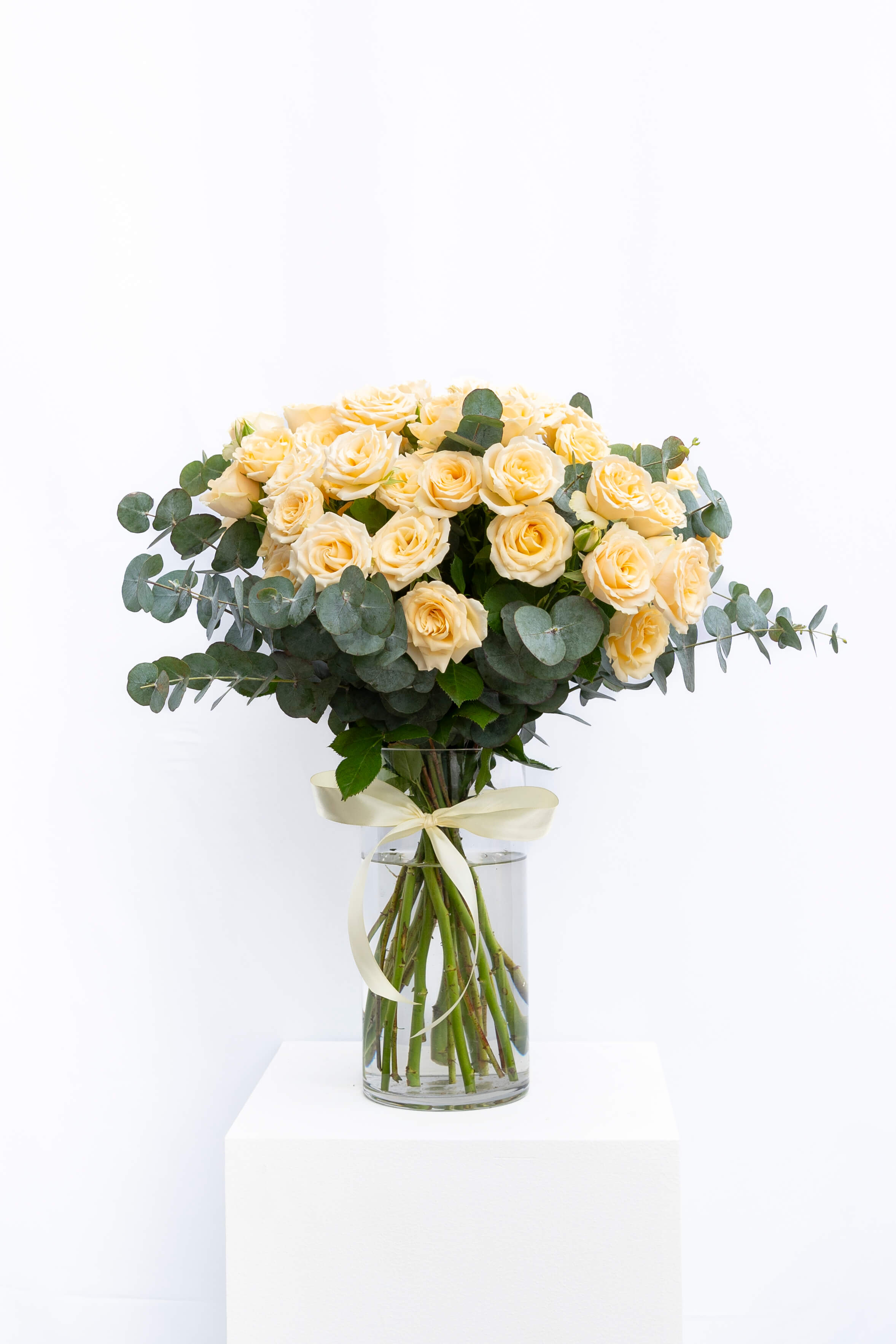 A fresh take on yellow roses. Salinero spray blooms bring warmth and fullness, while eucalyptus adds clean structure and contrast. Designed to feel bright, polished, and quietly premium.