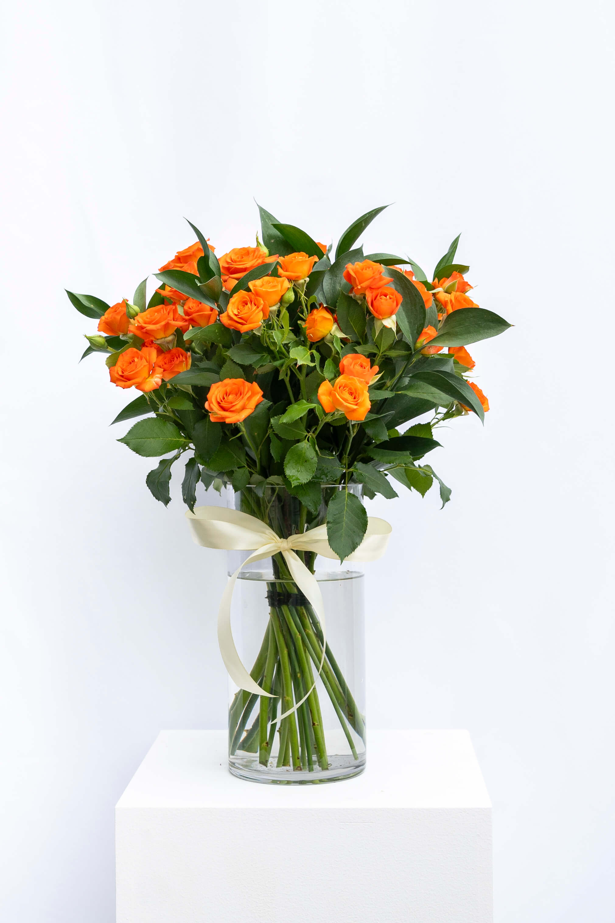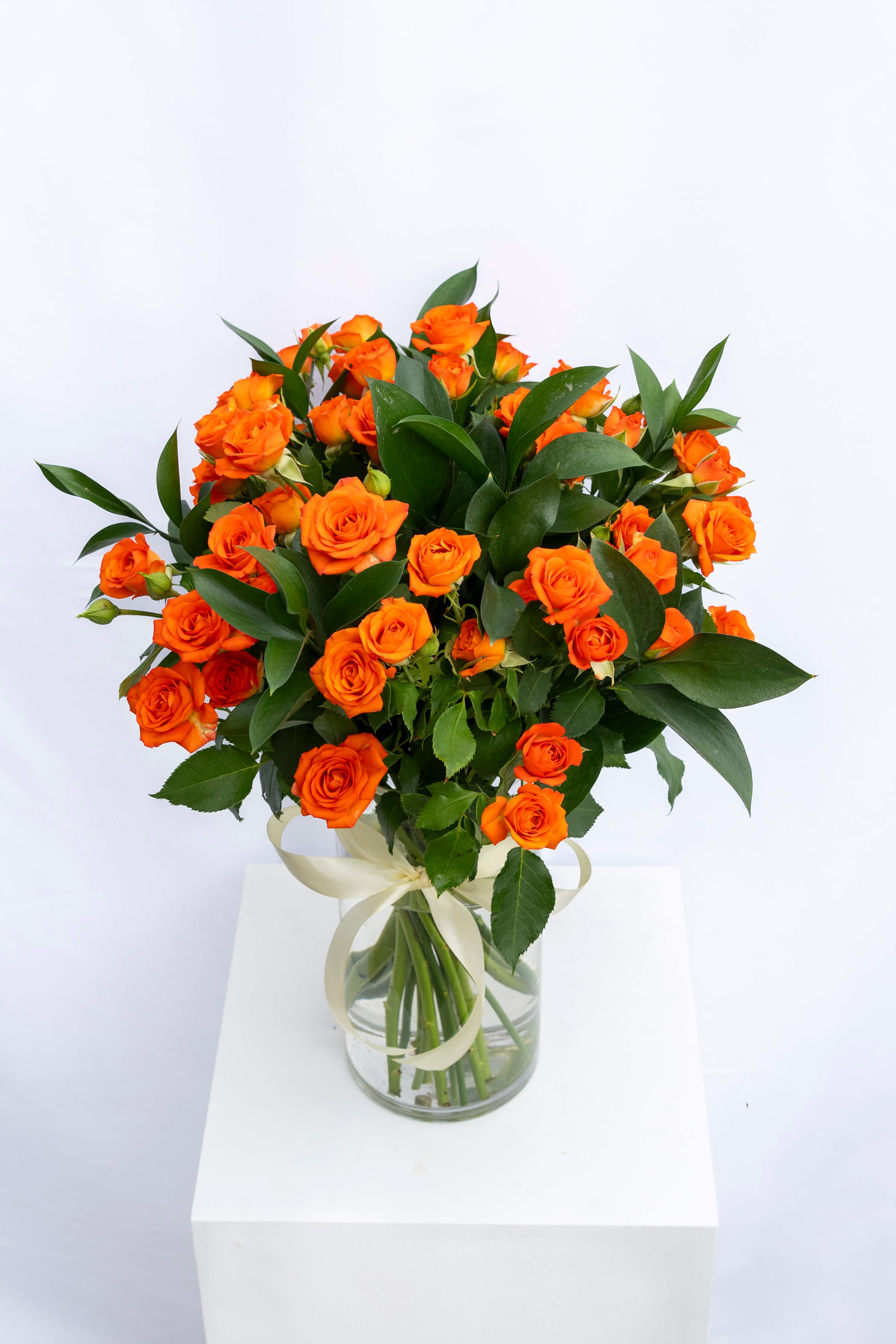 A bouquet made for the main character. Vivid orange spray roses with sleek ruscus foliage, designed to feel bold but polished. Perfect for celebrations, congratulations, and days that need a little extra light in Dubai.