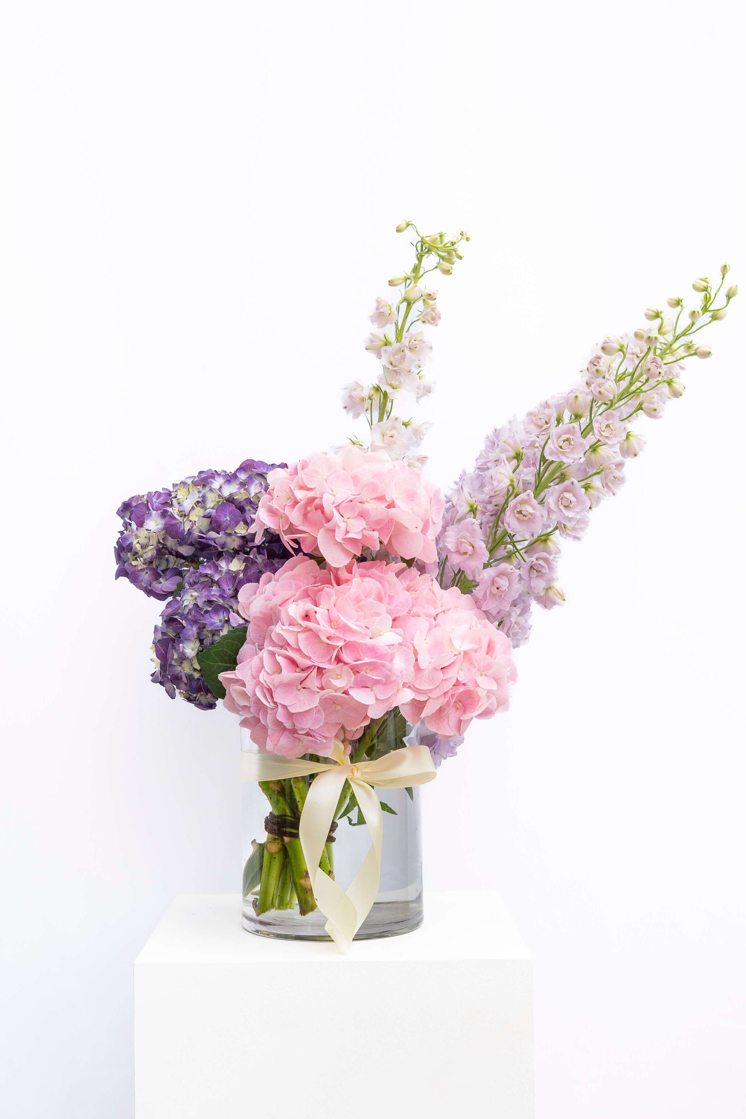A pastel bouquet with presence. Violet hydrangea depth, blush hydrangea softness, and a vertical delphinium finish that turns the whole arrangement into a clean, modern statement.