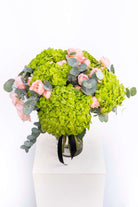 Like walking into a boutique garden. Cloudy emerald hydrangeas, delicate peach Julieta roses, and eucalyptus for that airy, styled finish. It is fresh, flattering, and impossible to ignore on a table.
