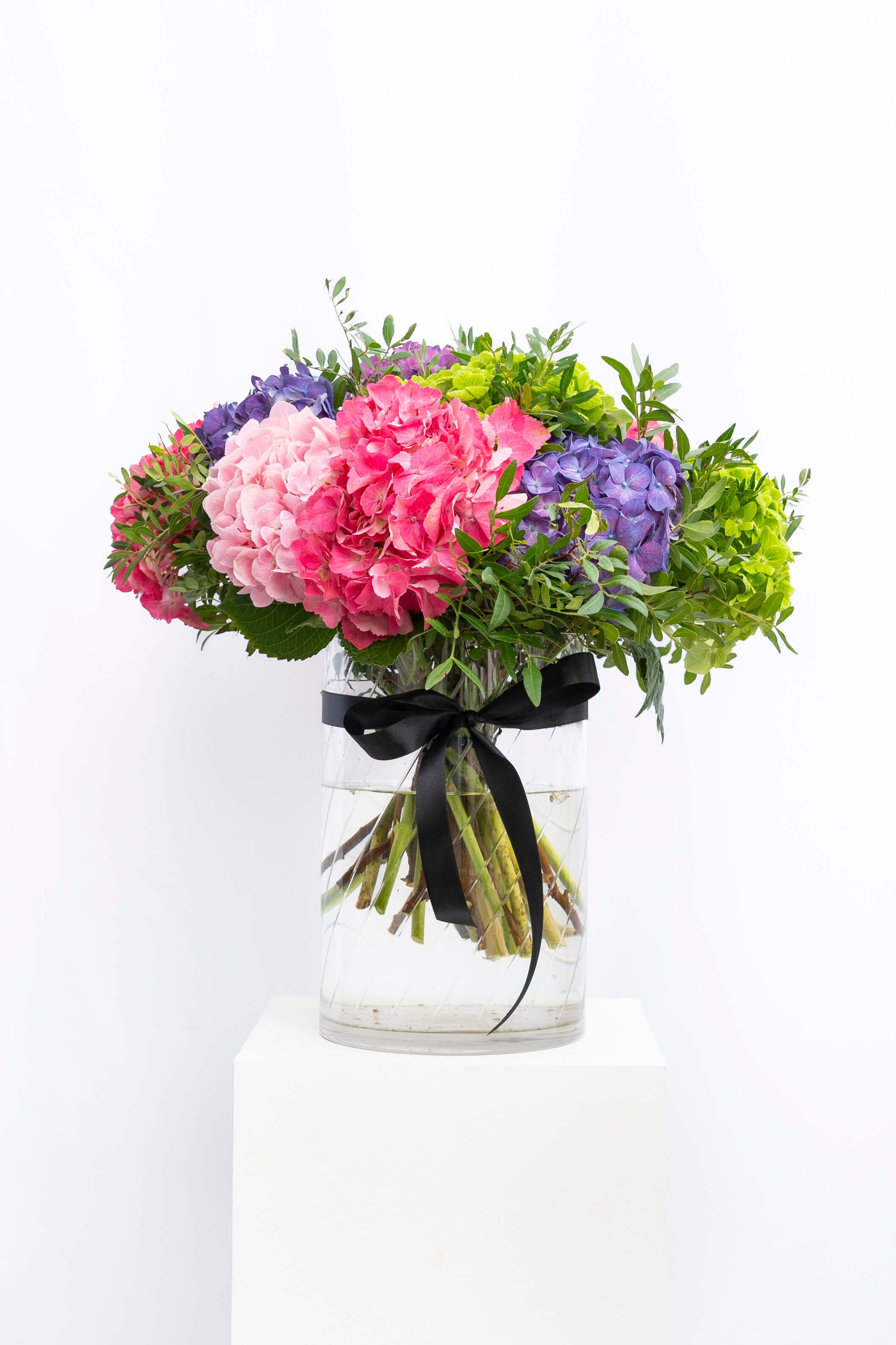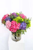 This bouquet doesn’t whisper. It fills the room. A mixed hydrangea selection in emerald green, raspberry purple, scarlet pink, and soft blush, rounded, plush, and seriously high-impact. If you want a “wow” moment without roses, this is it.