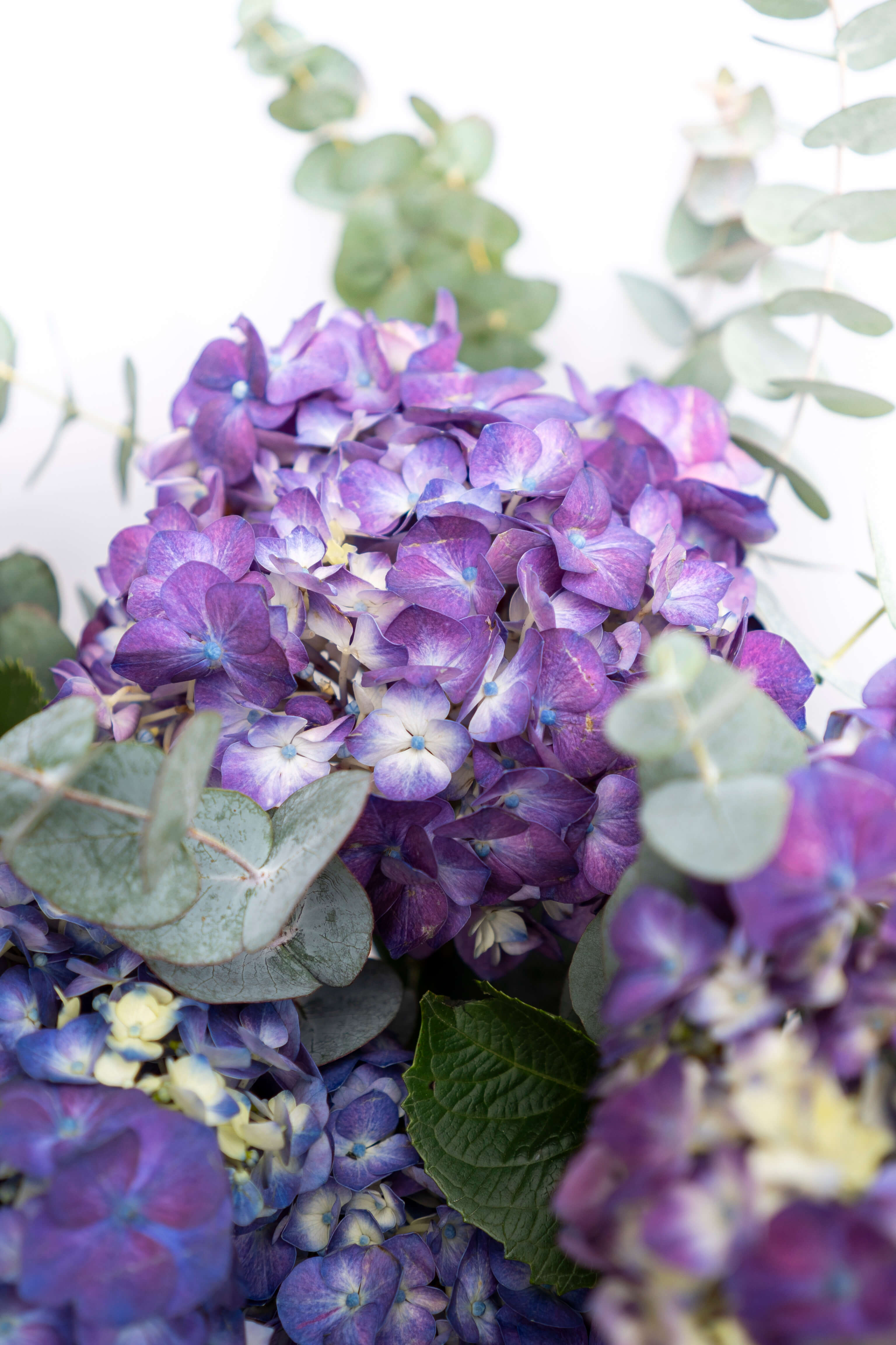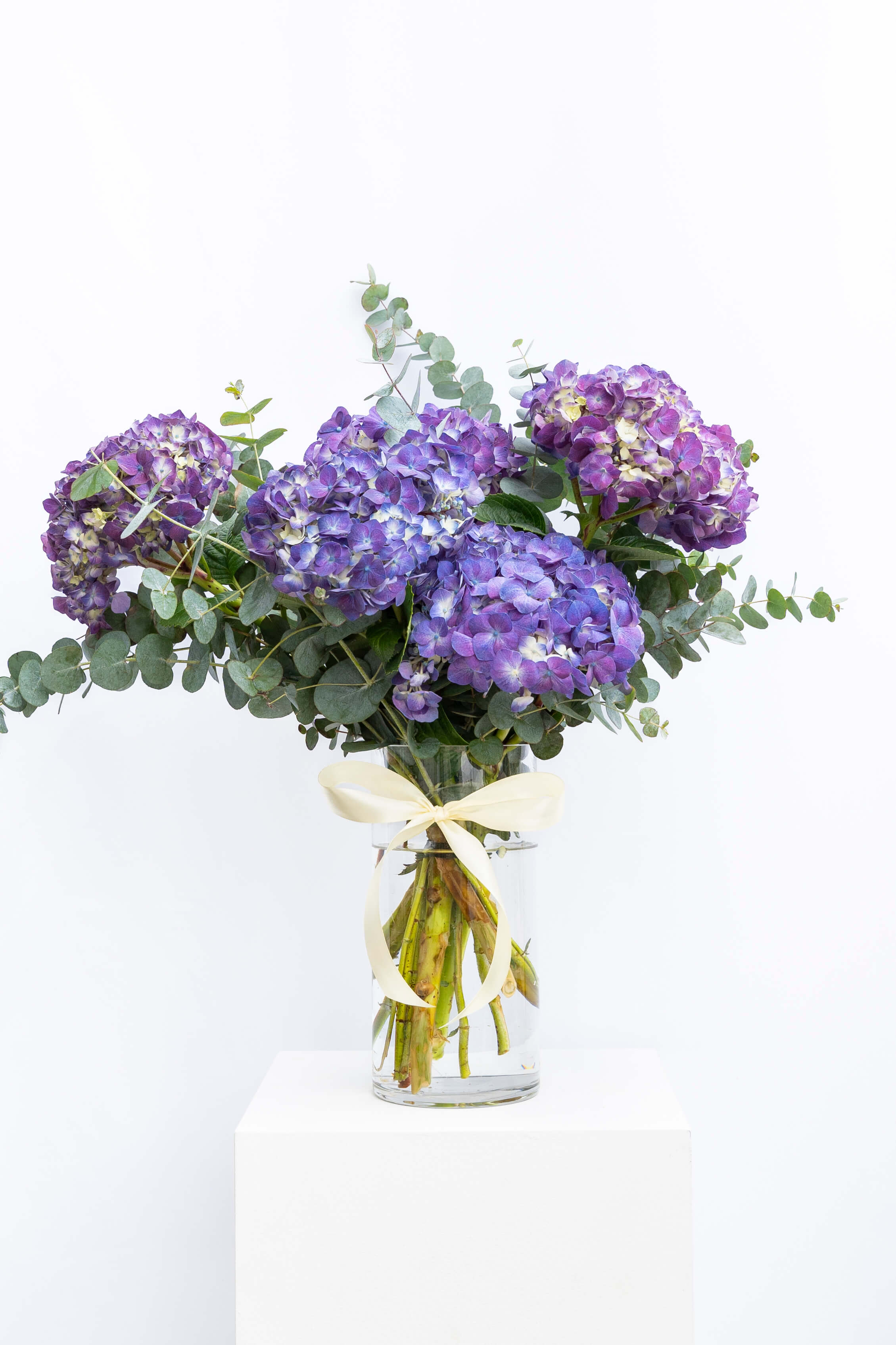This is drama, done properly. Deep purple hydrangeas create a full, cloud-like silhouette, while eucalyptus cuts through with cool, modern texture. Bold, polished, and impossible to ignore.